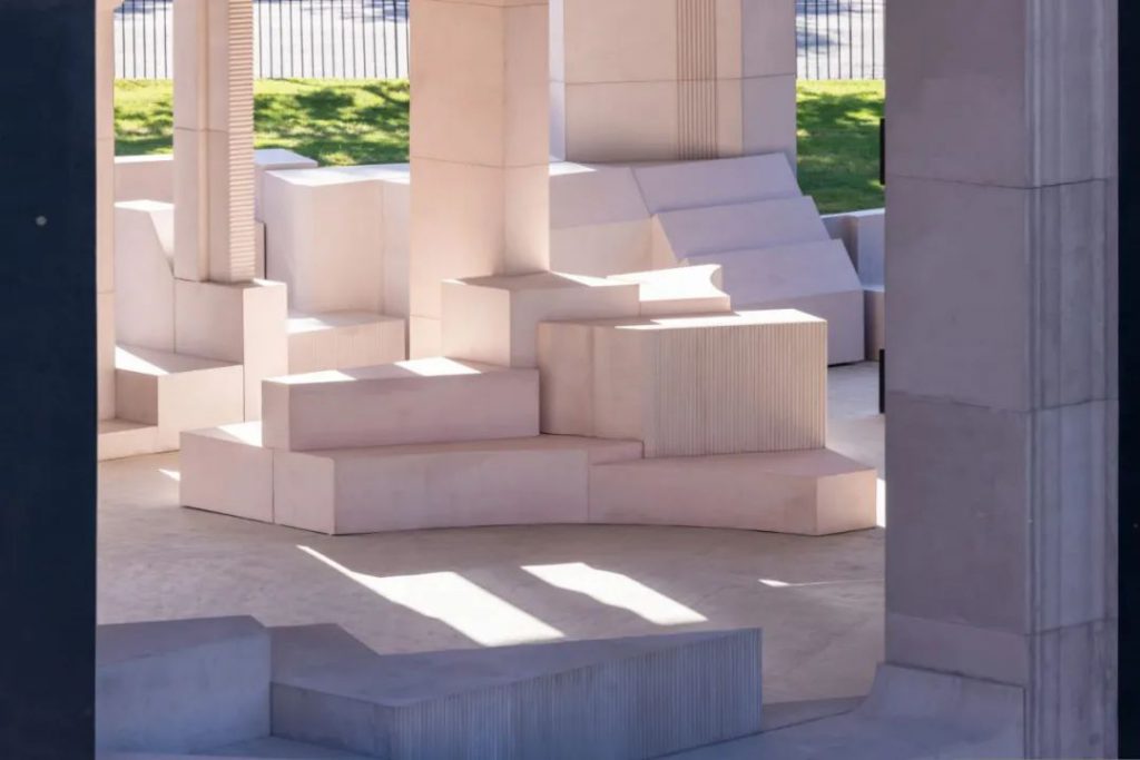展亭由多个柱子形成几何状的外观,为了在兴建过程中减少碳排放,Vally运用过去建筑设计中的钢材作为支撑结构,并以覆盖微水泥(microcement)的木材质、葡萄酒业回收的软木进行建造。整体以粉色调为主、咖啡色为辅的建筑外观,在不同时间的阳光照射下,呈现多样的纹理和色泽。